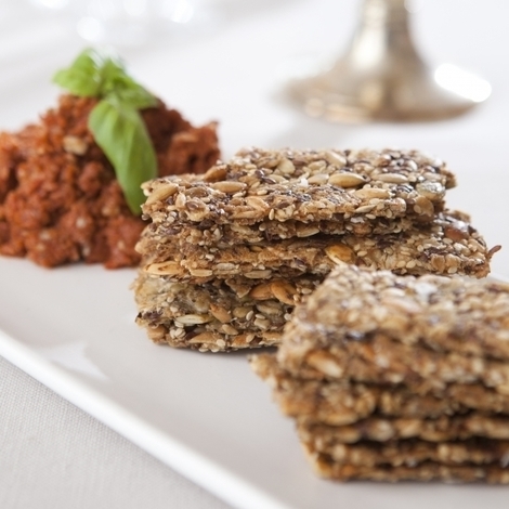 Följ instruktionerna på förpackningen. Efter mixen är klar, blanda ner rödbetan,blåbär och mandlar. Bred ut tunt på en plåt och strö över havssalt. Grädda i mitten av ugnen på 200 grader i 10 minuter, ta sedan ut plåten och skär upp knäcket i önskad storlek. Sänk värmen till 175 grader och låt grädda i 30-40 minuter.