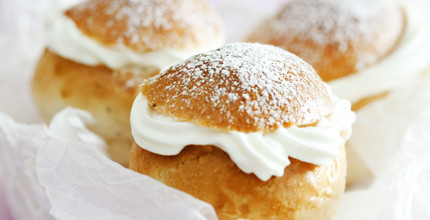 Skär av toppen på bullen. Gröp ur bullen så att det blir ett hål. Lägg det du gröpt ur i en skål och blanda med mandelmassa och lite mjölk, rör om ordentligt. Vispa grädde. Lägg mandelmassesmeten i hålet i bullen och på med grädde. Lägg på brödlocket och pudra med florsocker.